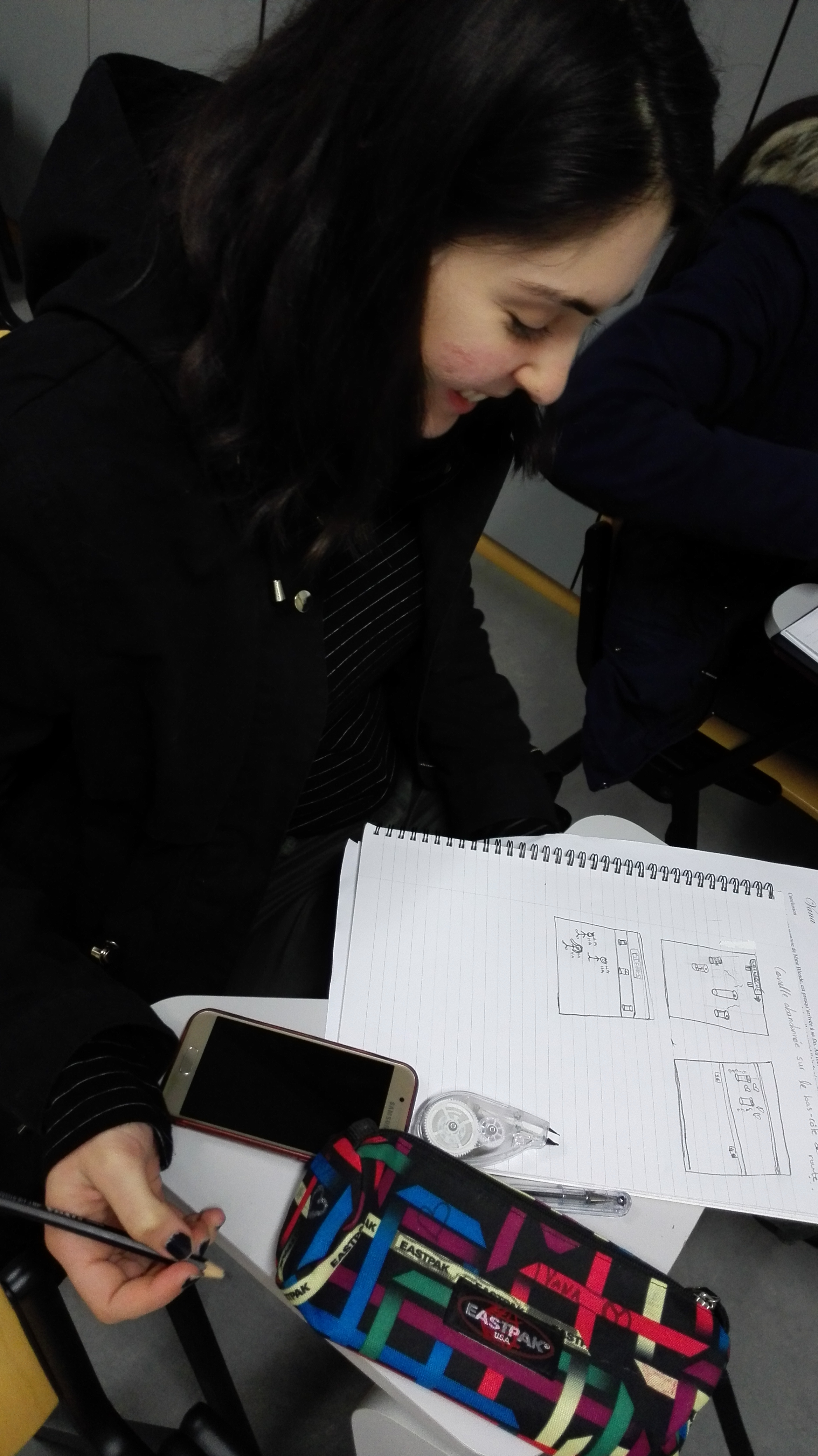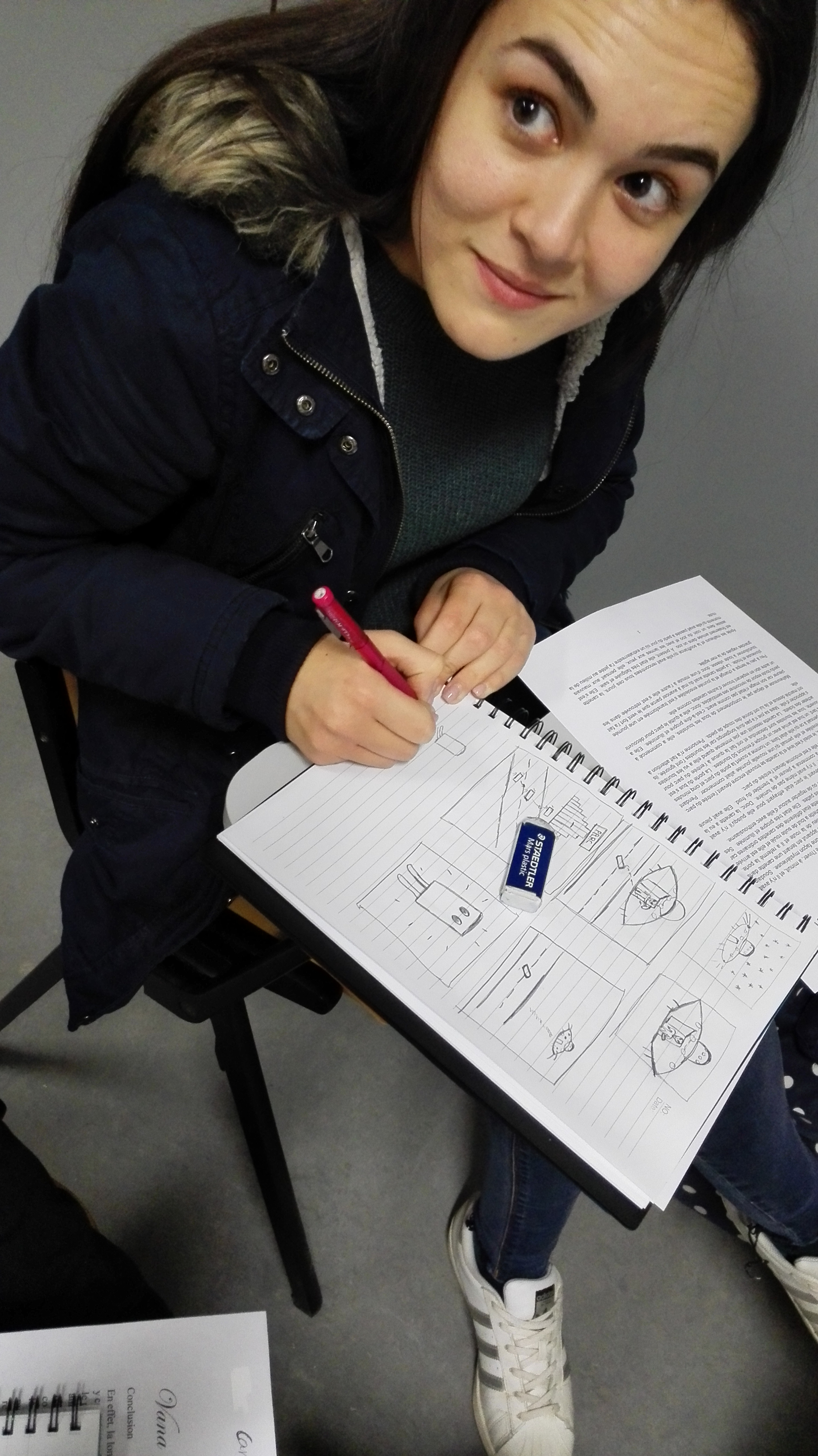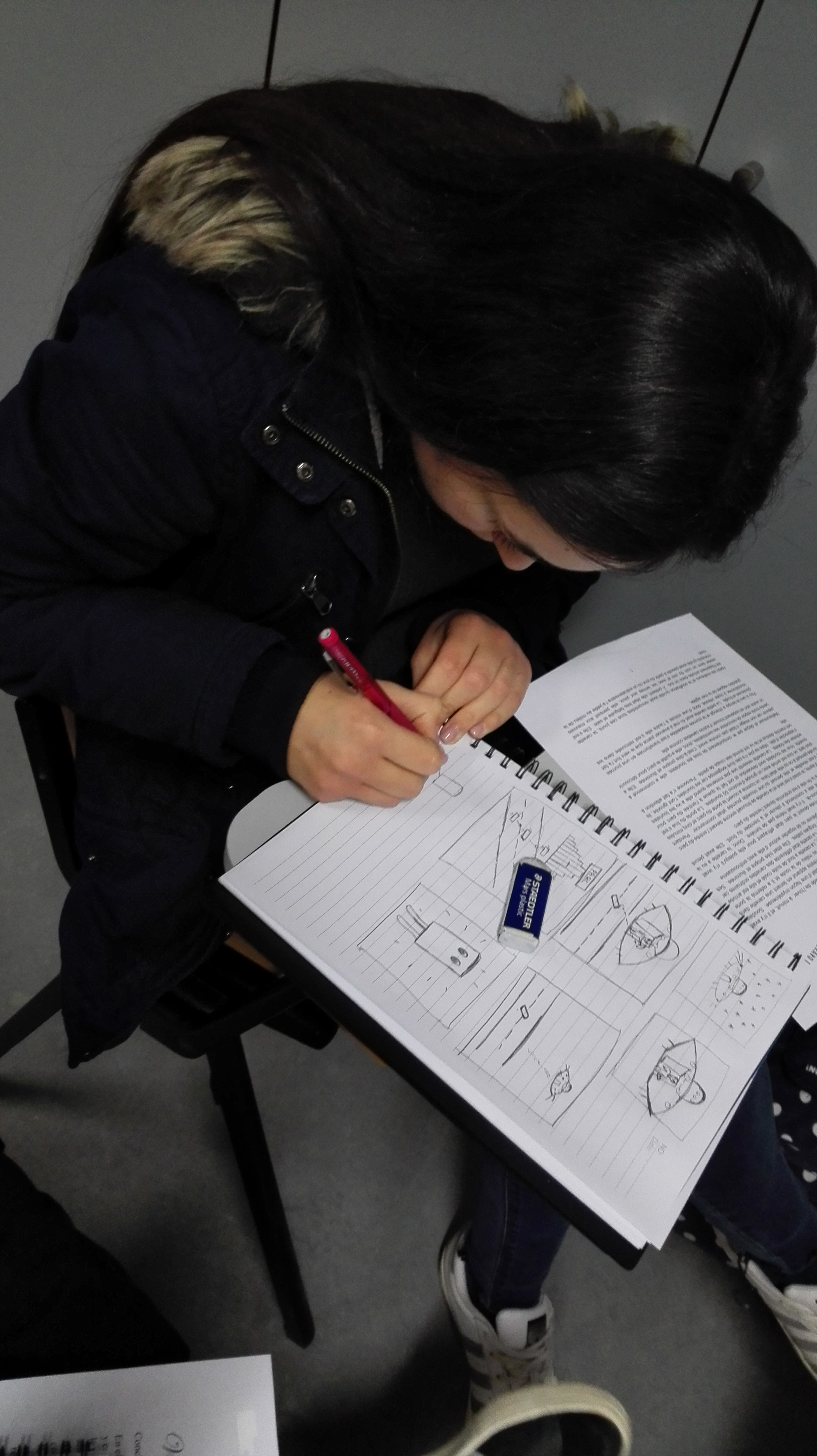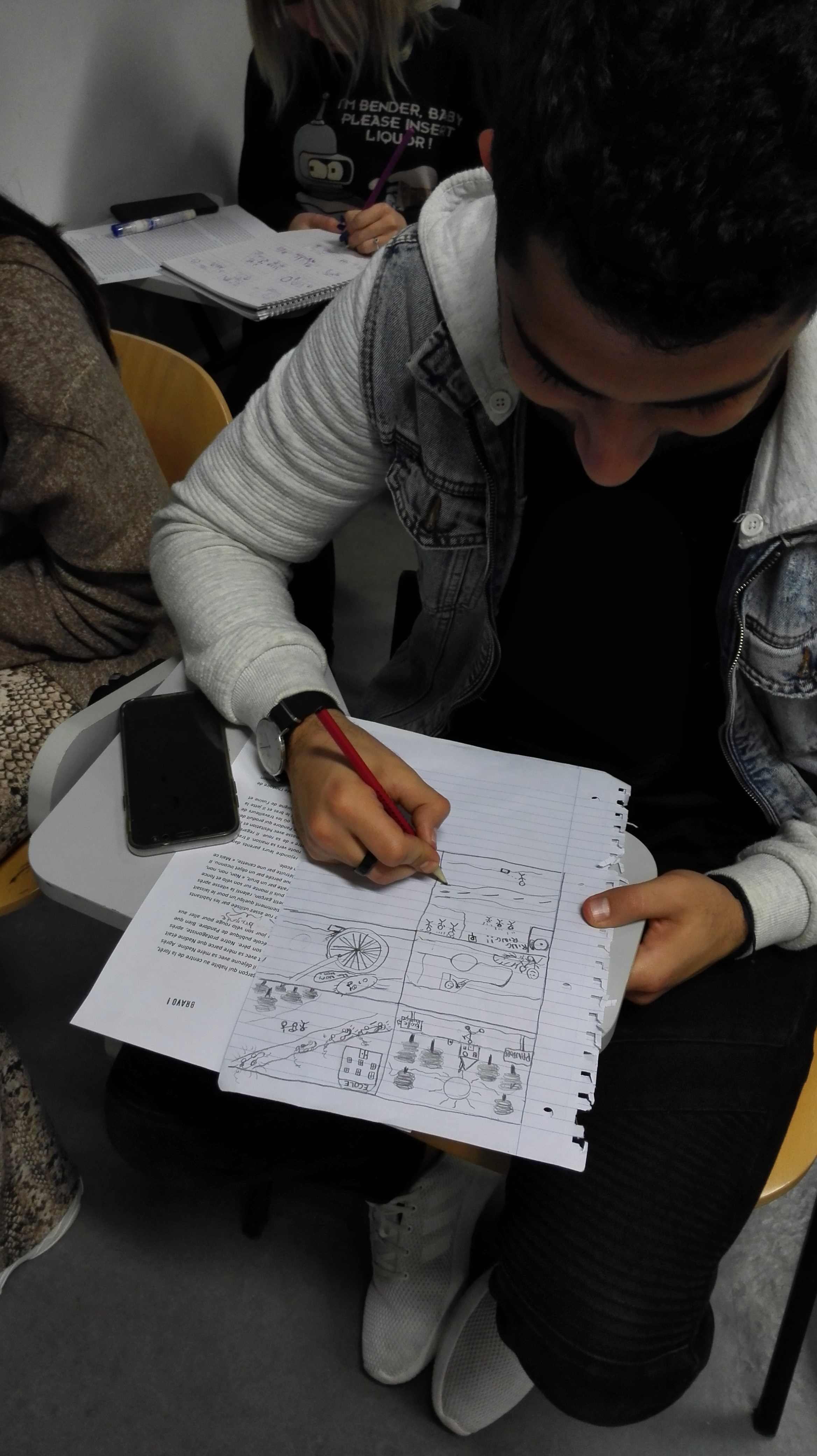 Le point de bascule est venu d’un déplacement très simple. J’ai cessé de demander d’écrire. J’ai demandé de dessiner. Non pour illustrer un texte à venir, mais pour faire émerger ce qui manquait précisément au texte : une situation, un cadre, des présences, des relations. La consigne était minimale, mais contraignante. Il fallait que quelque chose se passe quelque part, que quelqu’un soit impliqué, que l’objet – la canette – ait une place dans un ensemble.