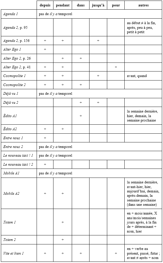 – D’autres méthodes insèrent il y a dans un paradigme sémantiquement hétérogène des expressions temporelles. Un exemple emblématique peut être celui de Agenda 2 [27]. Pour « situer dans le temps » (citation exacte du titre de l’encadré), il faudrait employer les expressions il y a, au début, à la fin, mais aussi... peu à peu et petit à petit (ex. petit à petit, je me suis habitué au froid) ; cinquante pages après, il y a est quand même intégré dans une triade plus logique basée sur les oppositions ponctuel/durable et initial/final, à savoir : point de départ d’une action (depuis, depuis que, il y a), point final d’une situation (jusqu’à) et durée (il y a ... que, pendant). Entre nous 2 appartiendrait à la même catégorie : sa section Grammaire [28] insère il y a trois jours entre hier et la semaine / l’année dernière pour parler d’un moment dans le passé, en plus des moyens utilisables pour parler d’un moment précis ; pour exprimer une période ; pour parler d’un intervalle de temps entre deux dates ; pour exprimer une idée de durée dans le passé et les marqueurs de continuité et de discontinuité. De même, Totem 1 évoque il y a dans une phrase à la page 80, mais lui consacre plus de place dans le mémento grammatical en fin de livre [29], en le classant parmi les moyens servant à indiquer un moment, énumérés dans le tableau ci-dessus, à côté des moyens à employer pour indiquer la chronologie, pour exprimer la durée et pour exprimer l’antériorité/la postériorité. Finalement, Vite et bien, dans sa démarche déductive, répertorie différentes expressions de temps en insistant sur leurs traits de sélection (verbe au présent, passé ou futur ; nom).