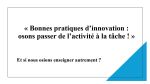 « Bonnes pratiques d’innovation : osons passer de l’activité à la tâche ! », Glykeria Vassiliou, Inspectrice de français, Ministère de l’Éducation → Transformation des activités classiques en tâches actionnelles contextualisées et motivantes.