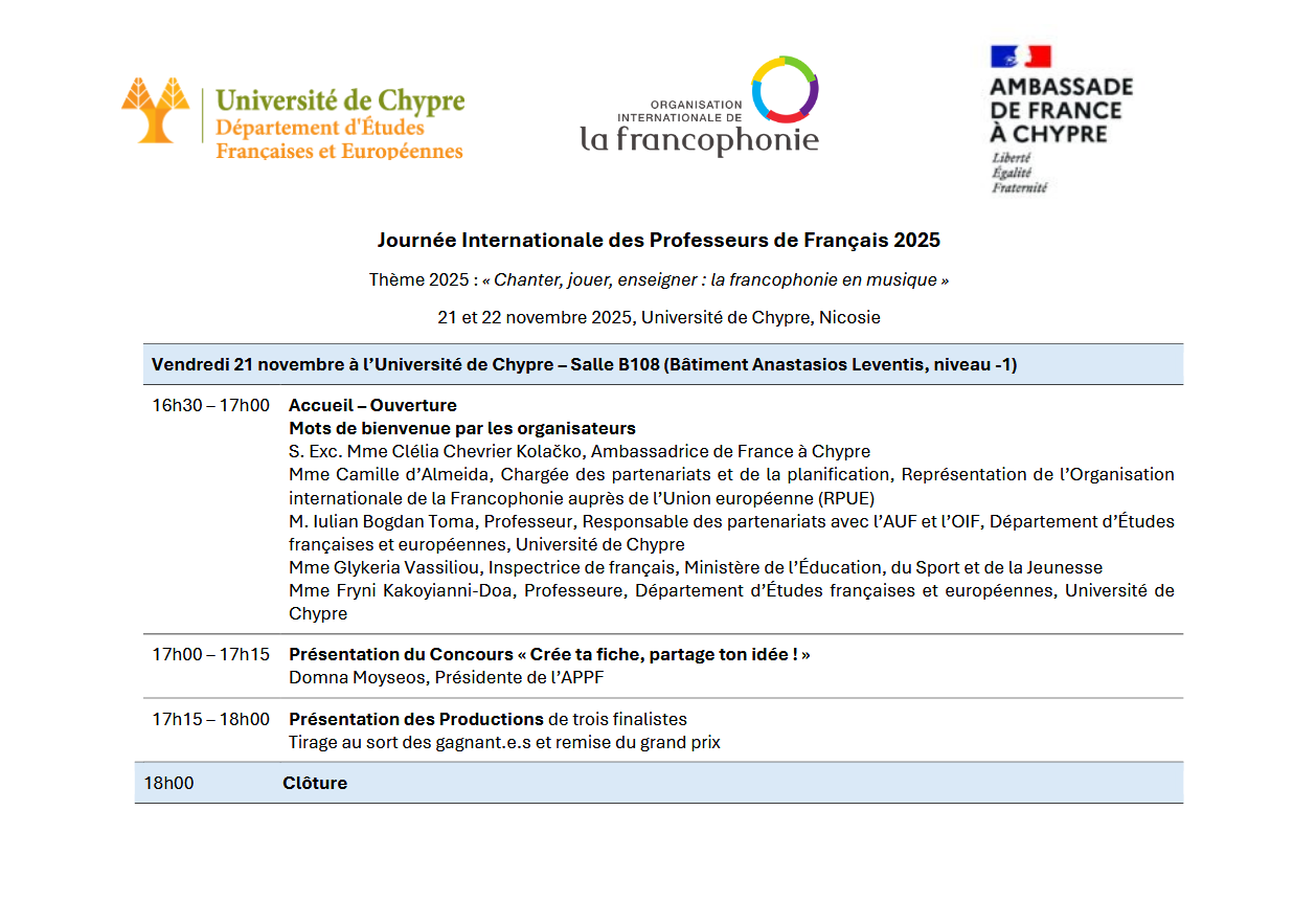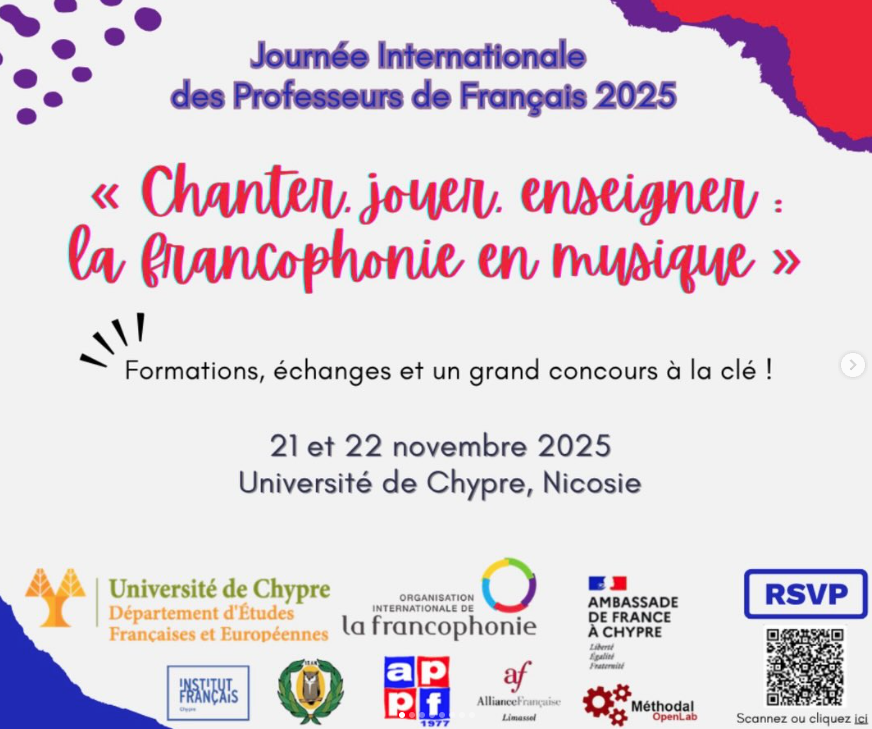 L’Université de Chypre accueillera donc, les 21 et 22 novembre 2025, la Journée Internationale des Professeurs de Français (JIPF), consacrée cette année à la question du rapport entre langue, pédagogie et pratique artistique.