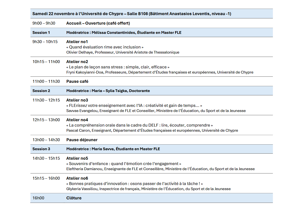 | Lieu | Université de Chypre, salle B108, bâtiment Anastasios Leventis (niveau -1) |