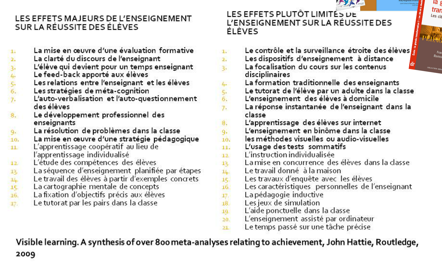 Le message est à double tranchant pour notre monde scolaire : d’une part, oui, l’enseignant a un effet majeur sur le parcours de réussite des élèves ; d’autre part, ce sont l’analyse du travail, la communication à autrui, la connaissance d’autres pratiques qui améliorent la valeur de sa propre pratique.