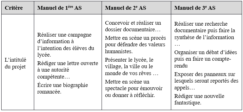 En troisième année du cycle secondaire, les trois projets sont remplacés par d’autres projets car les filières scientifiques et littéraires n’ont pas le même volume horaire et les enseignements diffèrent : « Des projets collectifs seront obligatoirement réalisés pendant l’année scolaire. Ils seront choisis par les apprenants après négociation avec le professeur. Ceux-ci sont donnés à titre d’exemple. Il va sans dire que le projet portant sur l’appel ne concernera que les classes de lettres » (Programme de 3e AS, 2007, p. 74).