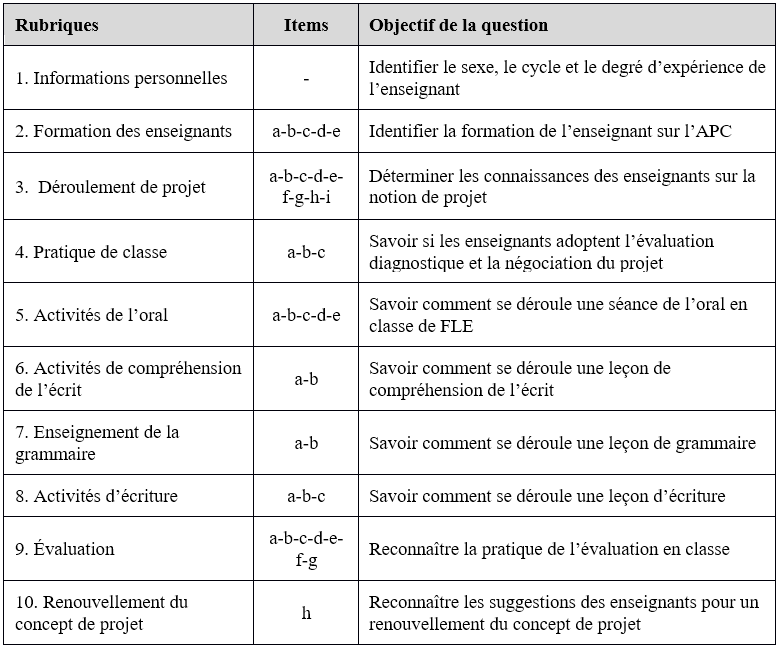 Le questionnaire comprend dix rubriques regroupées dans le tableau ci-dessous (Tableau 2). Toutefois, nous ne présenterons que les celles qui sont en rapport avec le déroulement du projet en classe de FLE.