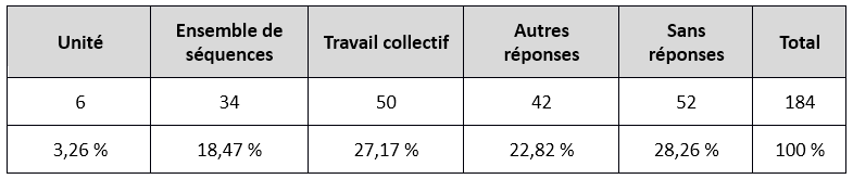 D’autres enseignants (27,17 %) le définissent comme étant un travail collectif mettant en œuvre un apprentissage. D’autres encore le considèrent comme un ensemble de séquences ou alors le confondent avec le thème de l’unité.