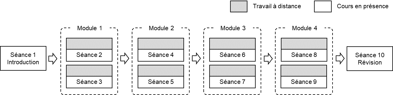Un module représente deux semaines de travail et est dispensé sur 2 séances pédagogiques (cf. Figure 2). Une séance s’organise autour d’un thème particulier, qui se compose de différents éléments articulés entre des modes présentiel et distanciel, formant un ensemble cohérent (cf. Figure 4) : les étudiants apprennent d’abord, à distance, les formes linguistiques liées à la thématique de la séance pédagogique au moyen de courtes vidéos et d’exercices de systématisation, dans lesquels ils retrouvent les éléments linguistiques qui seront ensuite réutilisés lors des activités de production en classe.