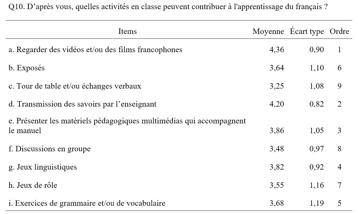 Si la raison principale à l’apprentissage du français est « pour s’ouvrir vers le monde extérieur », il n’est pas étonnant que les activités culturelles et interculturelles en classe, telles que regarder des vidéos et/ou des films francophones (=4,36) (cf. Tableau 1), soient celles qui sont préférées par les étudiants. Néanmoins, leurs besoins pour la communication orale, que l’on a déjà évoqués, semblent en contradiction avec les réponses données : ils considèrent que les activités centrées sur la communication orale, telles que le tour de table (x̅=3,25), la discussion en groupe (x̅=3,48), les jeux de rôle (x̅=3,55) et les exposés (x̅=3,64), ont moins d’importance que la transmission du savoir par l’enseignant (x̅=4,20). Nous retrouvons des résultats similaires concernant les besoins d’activités hors classe (cf. Annexe, Q13) : ils préfèrent les exercices de systématisation (x̅=3,96) aux activités axées sur la communication, telles que tâches et/ou projets en groupe (x̅=3,59) et Tandem avec des locuteurs francophones pour pratiquer l’oral (x̅=3,78). On pourrait faire l’hypothèse que cette contradiction relève de l’anxiété face à la prise de parole et du sentiment d’auto-efficacité des apprenants (Liu et Jackson, 2008). En effet, les étudiants chinois, influencés par leurs habitudes culturelles d’apprentissage, se sentiraient plus à l’aise lors de la prise de parole s’ils maîtrisent de manière explicite tous les points de grammaire au préalable. (Wen et Clément, 2003, p. 30).