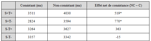 Tableau 2 : Temps de réaction (TR) en millisecondes (ms) pour les 8 conditions expérimentales, et effets nets de consistance (NC-C). Les effets significatifs sont indiqués par un astérisque.